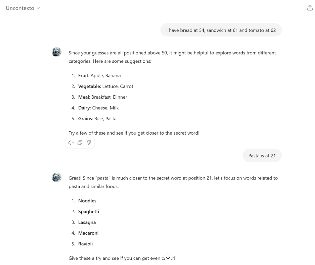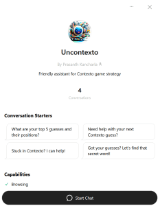 But with a GPT created specifically to help me with the puzzle, I can directly start the conversation by giving it the position of the words and get the hint. Because the GPT is already aware of the context. I created a GPT named ‘Uncontexto’ that can help with hints to solve the puzzle. Here is an example conversation with Uncontexto GPT.