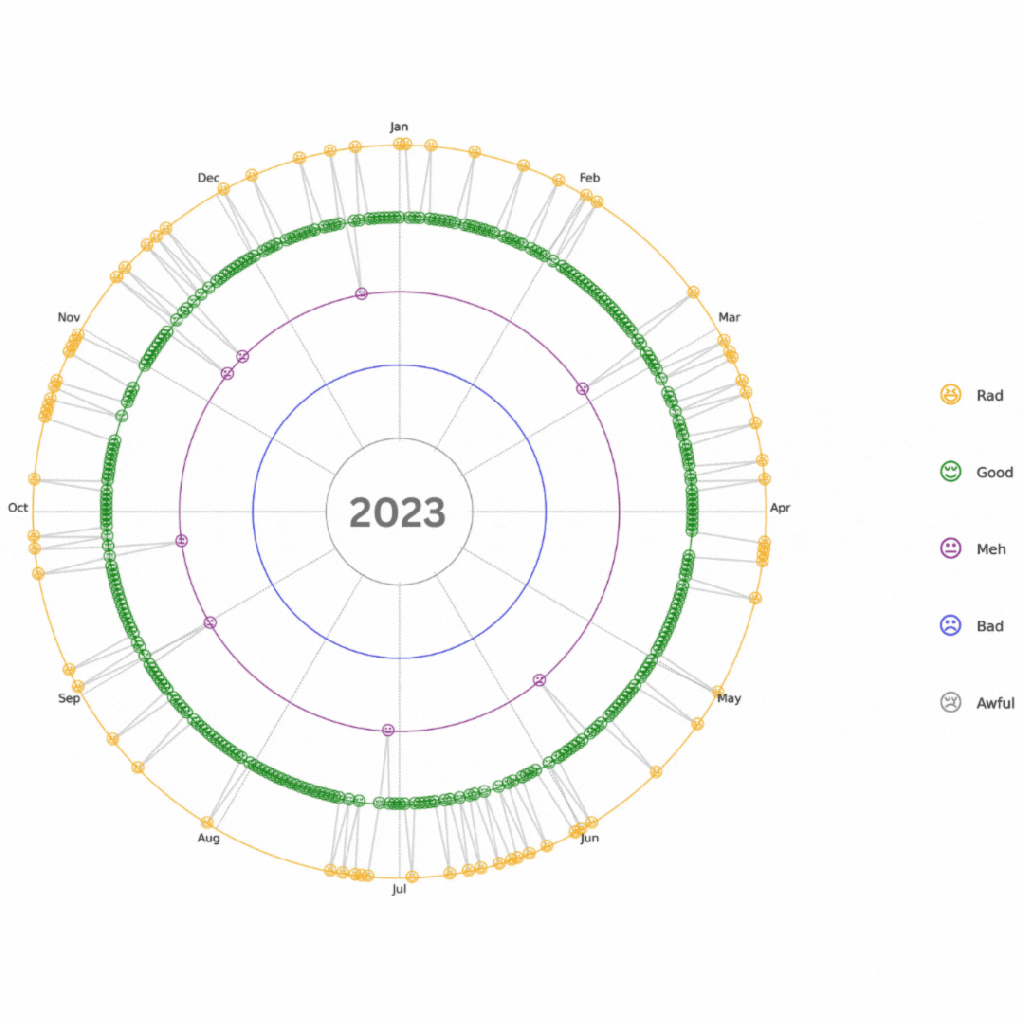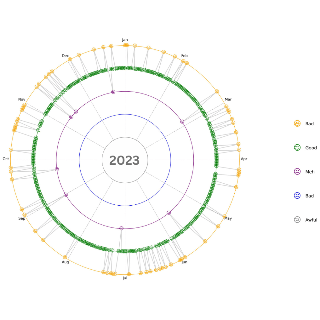 In the below chart, I created a representation of my moods over the 365 days period to show how it varied across 2023: