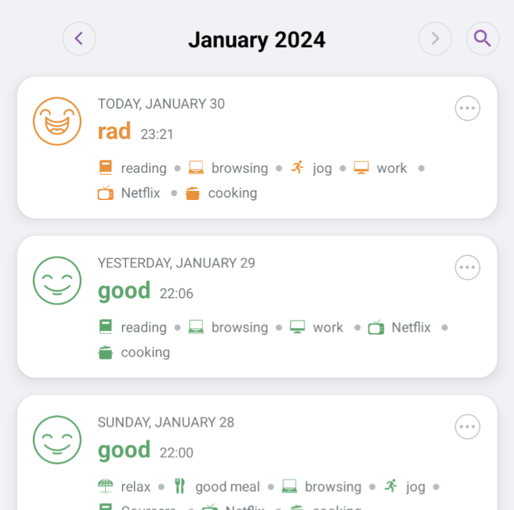 I’ve always struggled to keep up with my personal journal. Despite knowing the benefits of taking time to reflect on my thoughts daily, maintaining the habit has been a challenge. I still try and have experimented with a few tools to help me along. A few years ago, I discovered Daylio—a minimalist journal app that lets you log key moments in your day with just a few clicks. I began using Daylio as a supplement to my traditional journal. While I remained inconsistent with my other journal, I’ve been remarkably consistent with Daylio ever since I installed it. I believe the genius of Daylio lies in its design— it not only kept me on track, but it has also provided insights I never got from traditional journaling.